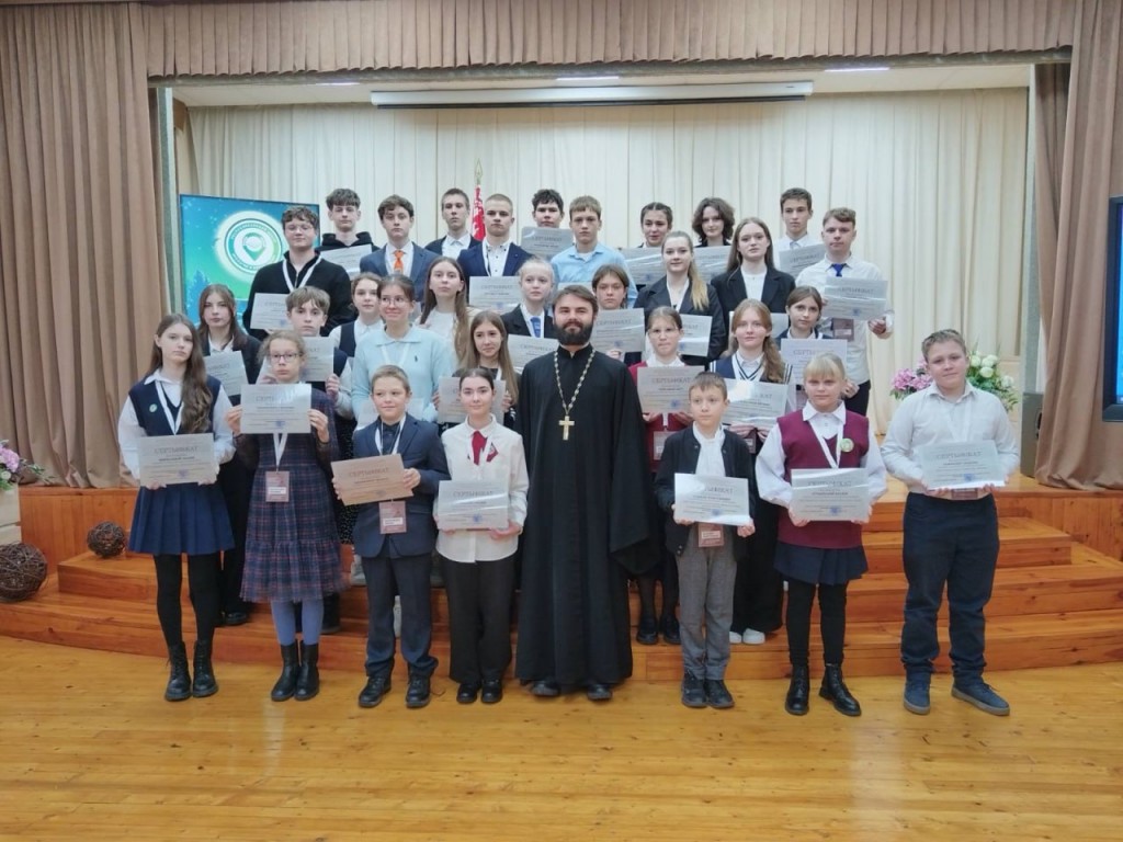 На пленарном заседании выступил Никита Оснач (ГУО «Красненская средняя школа» Гомельского района) на тему: «Старопечатное издание Нового Завета. Из собрания историко-краеведческого музея Красненской школы»