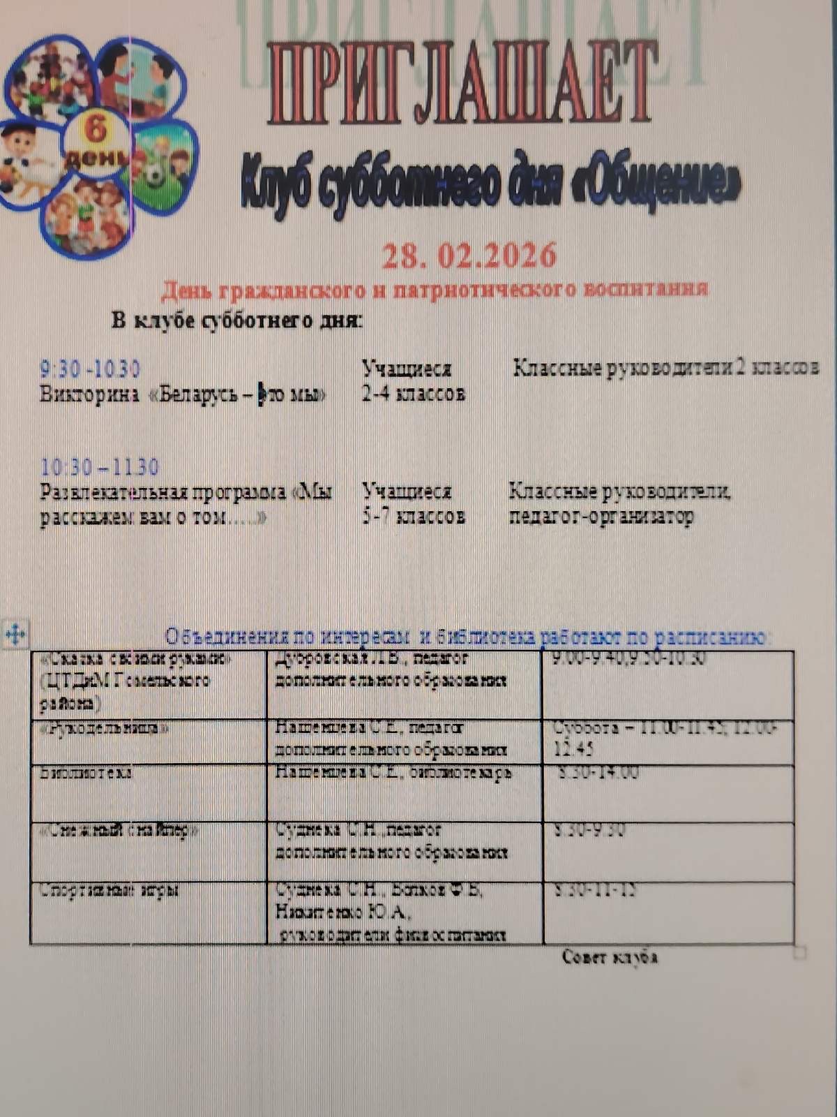 Информация о плане проведения субботнего дня вывешивается на информационном стенде в понедельник. Размещается фотоотчет о субботнем дне прошедшей недели, итогах конкурсов.